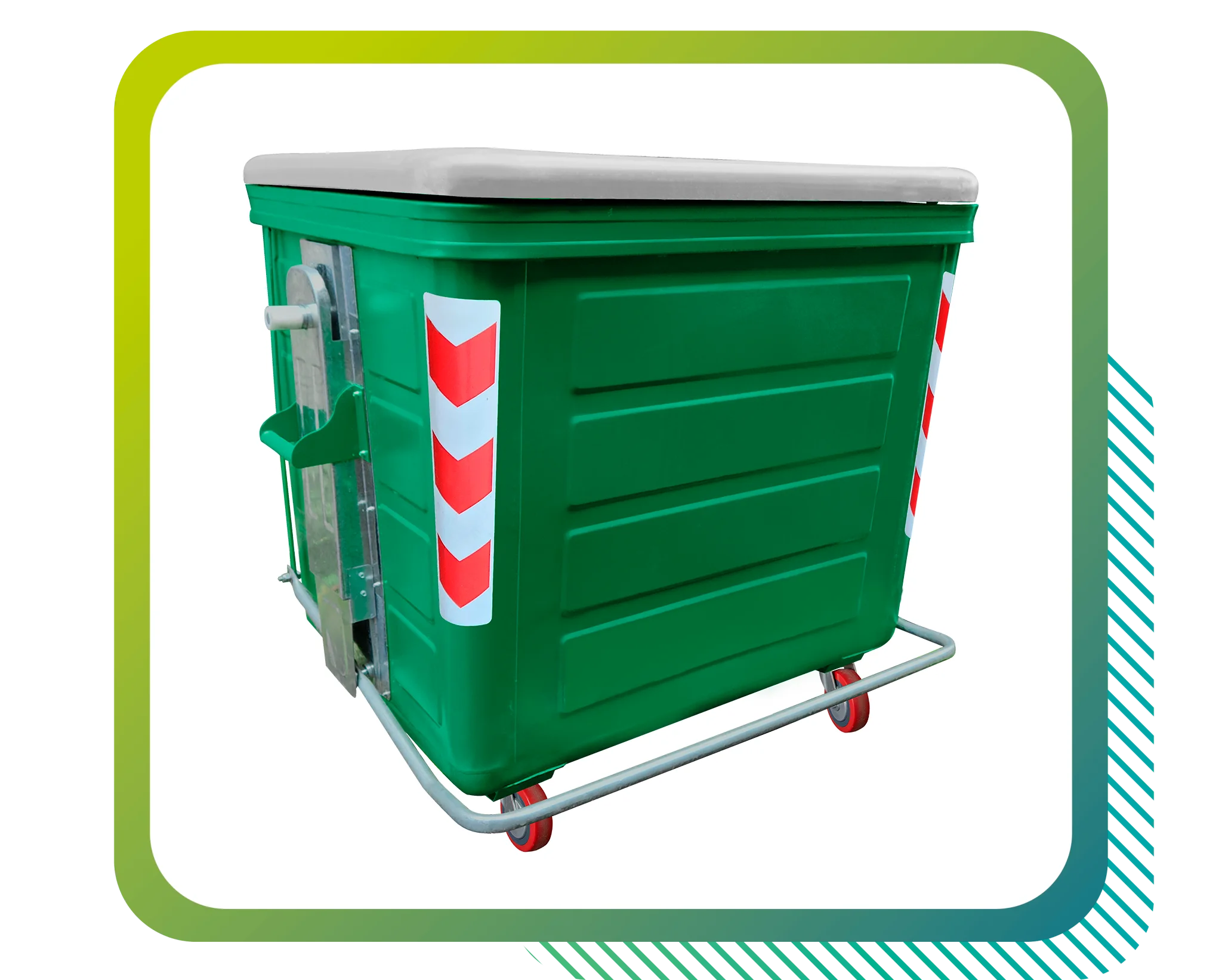 Contenedor de 1100 L. TINAS Tinas de 1100 L. Tinas de 1300 L. CONTENEDORES Contenedor de 1100 L. Contenedor de 1300 L. Contenedor de 1700 L. Contenedor de 2400 L. Contenedor de 3200 L. Contenedor de 3000 L. ISLAS SOTERRADAS Isla Soterrada Ecológica VEHÍCULOS Vehículos para Recolección Caja Compactadora Sistema Lifter PAPELERAS Papeleras Decorativas Papeleras Ornamentales NUEVOS PROYECTOS Clínicas Móviles Contenedor Inclusivo CARACTERÍSTICAS CAPACIDAD: 1100 L. PESO EN VACÍO: 110 kg CARGA NOMINAL: 440 kg. MATERIAL: Acero Galvanizado ASTM A 653 PINTURA: Electroestática BRANDEO: Señalética Preventiva / Logo (Diseño Personalizado) COMPATIBLE: Con sistema de carga posterior (Sistema lifter) MOVILIDAD: 4 Ruedas, incluye 2 frenos de seguridad.